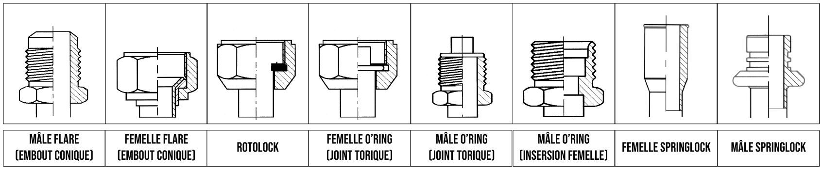 ▪️Les différents types de raccords (Flare, O’ring, Rotolock, Springlock, brides…) et raccords spéciaux,