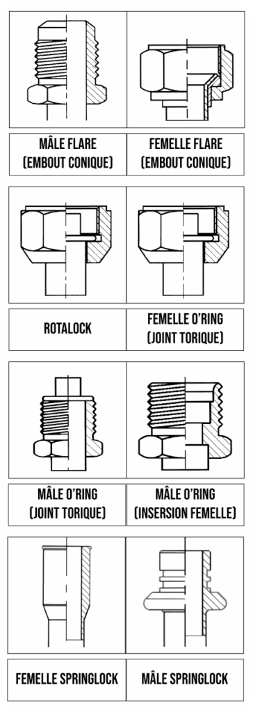 Pour simplifier, on distingue quatre familles principales de raccords dans les systèmes de climatisation automotive :